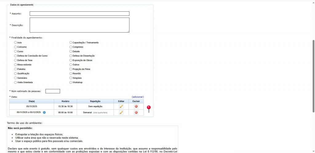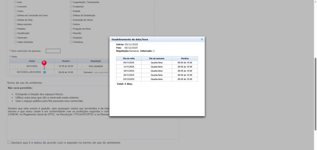 10. Para adicionar um novo dia da semana, execute os passos 7 e 8, informando a data correta. Neste exemplo, foi adicionado também uma reserva para todas as quartas-feiras de novembro a dezembro, das 08:20 às 10:00.