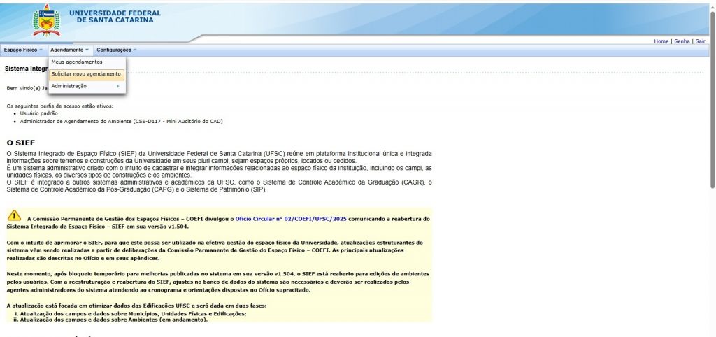 1. Acesse o sistema https://sief.sistemas.ufsc.br e utilize o menu superior para acessar Agendamento > Solicitar novo agendamento.