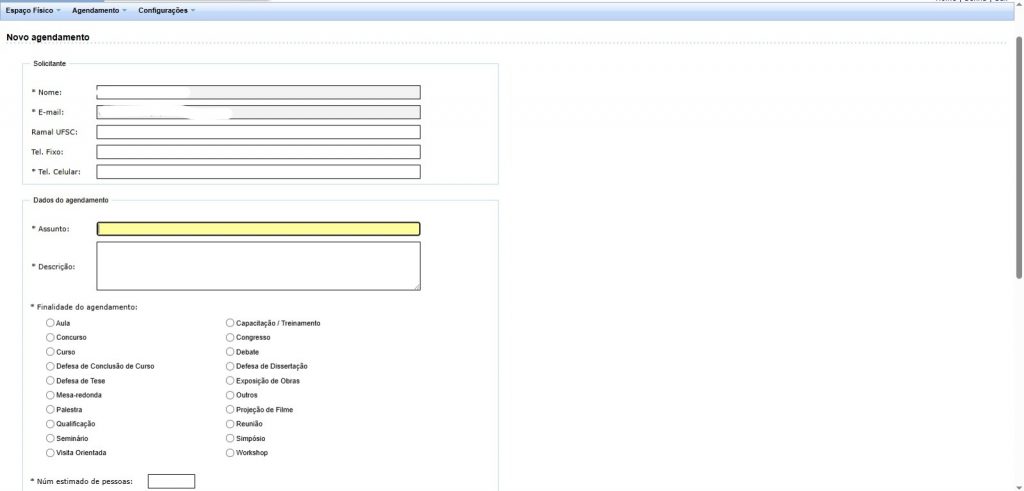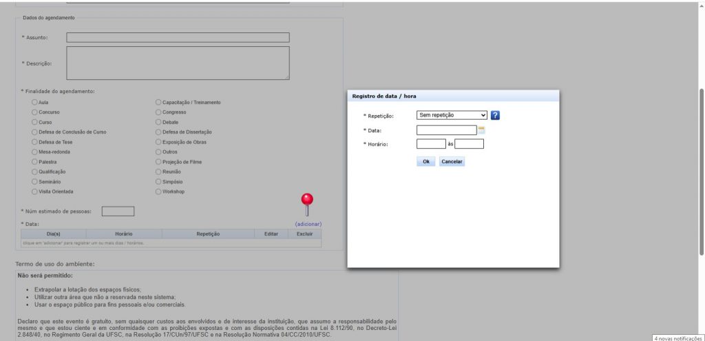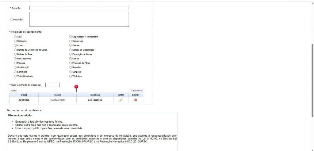 Assunto:Informe o código e nome da disciplina, no padrãoDPT 1234 - Descrição(por exemploCNM 7421 - Econometria) ou o nome do evento.Descrição:Informe o mesmo conteúdo do campo anterior ou uma descrição mais detalhada sobre o evento.