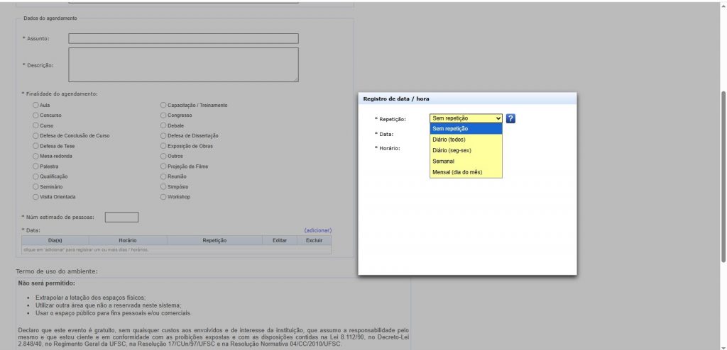 8. Quando a aula ou evento for realizado em datas específicas (como por exemplo um dia no começo do semestre e outro no final), utilizar a opção Repetição: Sem repetição. Quando houver repetição (como o caso de aulas todas as segundas e quintas), usar a opção de Repetição: Semanal.
